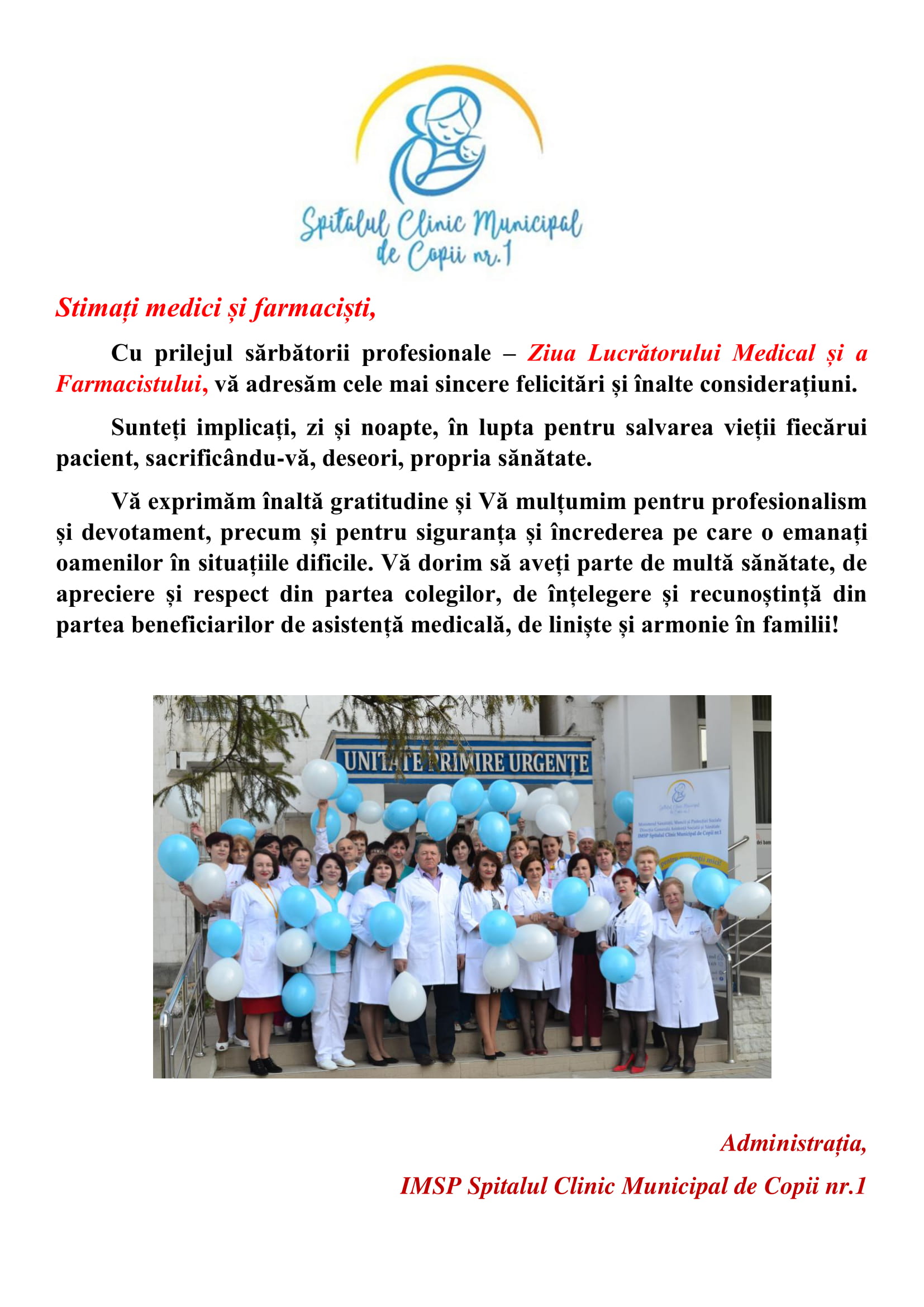 Administrația IMSP SCMC nr.1, în persoana directorului instituției, dna Aliona Rotari, a adus mulțumiri tuturor angajaților pentru eforturile depuse în acordarea asistenței medicale de calitate copiilor în perioada respectivă.