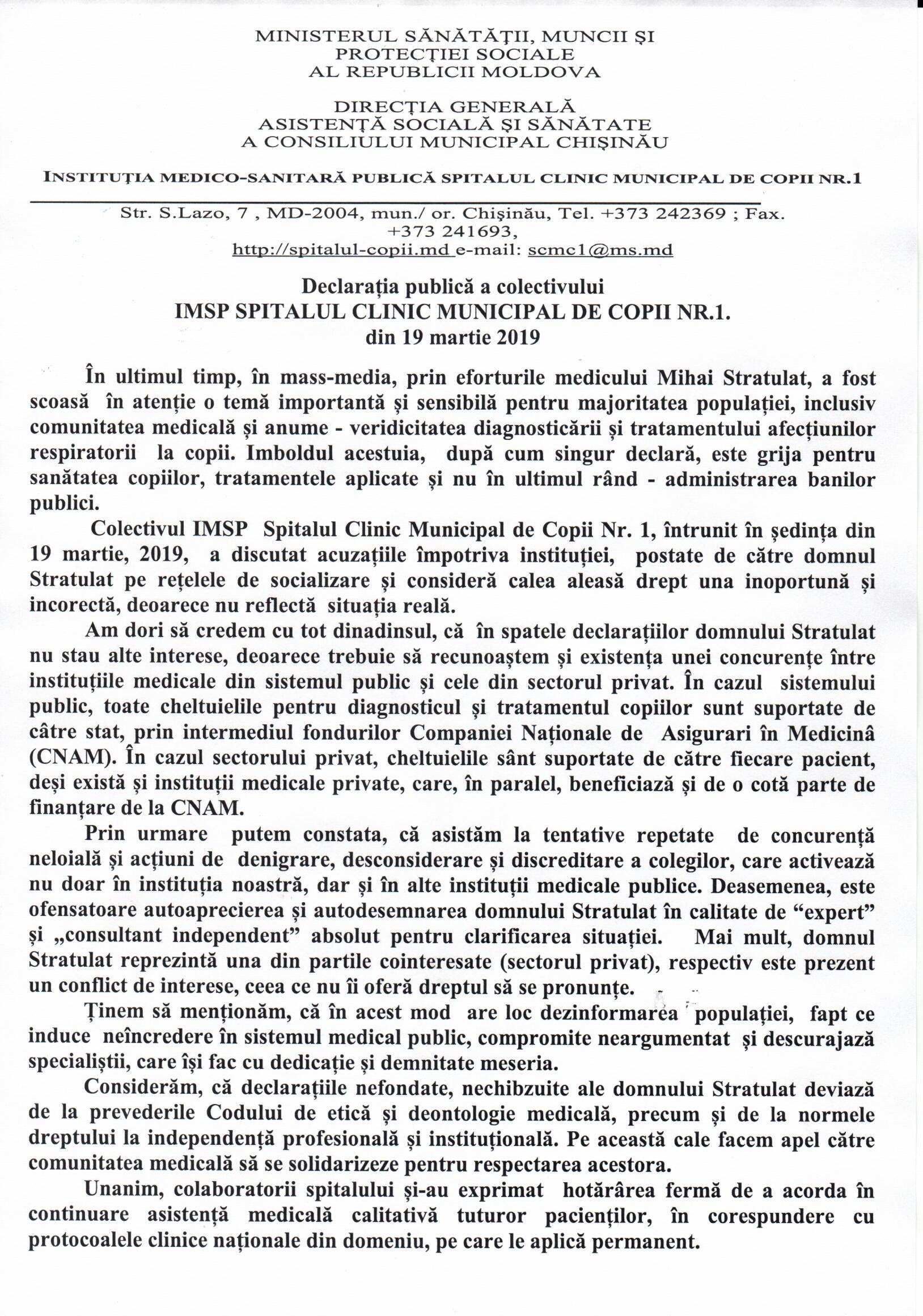 Admistrația spitalului IMSP Spitalul Clinic Municipal de Copii nr.1, în urma cercetării documentației medicale si discuției cu personalul medical, implicat în asistența medicală a copiilor respectivi va informează: