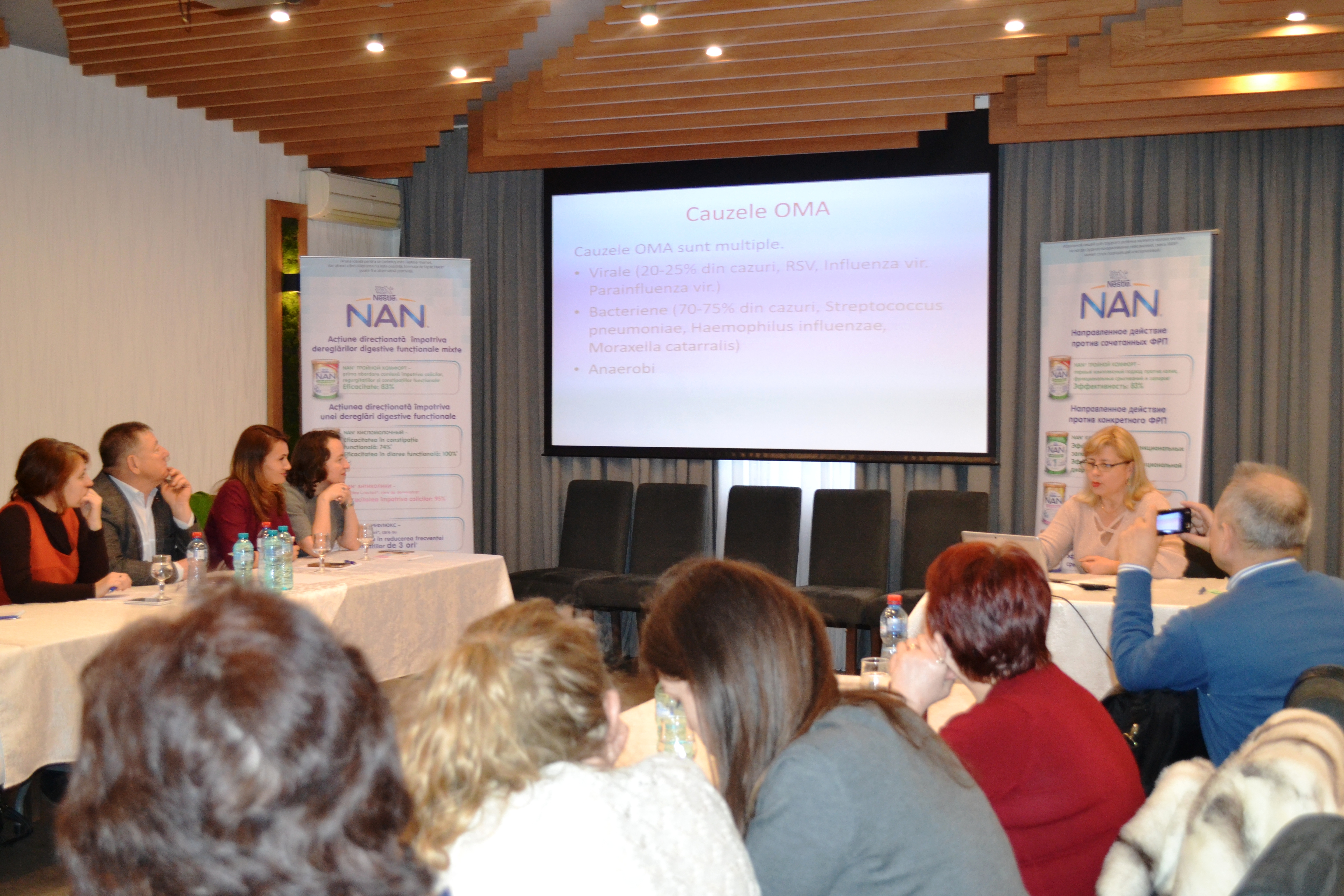 Colectivul IMSP SCMC nr.1, de comun cu colaboratorii Clinicii universitare, Departamentul pediatrie USMF "Nicolae Testemițanu", s-a întrunit în data de 14 martie curent la Conferința științifico-practică, avînd ca tema generală "Profilaxia și tratamentul infecțiilor respiratorii la copii, în viziune actualizată". S-au prezentat doua rapoarte, care au adus în discuție noile prevederi din domeniu, inclusiv actualizările operate în ghidurile de conduită clinică la nivel international. Doamna Ala Holban, dr.șt.med., conferențiar universitar, a prezentat mai multe aspecte ce țin de noile viziuni asupra profilaxiei și tratamentului infecțiilor respiratorii acute la copii, iar dna Elena Proaspăt, specialist ORL al clinicii, a venit cu informații privind diagnosticul și conduita clinică a otitei acute la copii, inclusiv particularitățile tabloului otoscopic. Informațiile prezentate au trezit mai multe întrebari și discuții, fiind înalt apreciate de către participanții la conferință, la care au fost prezenți toți specialiștii Clinicii Universitare IMSP SCMC nr.1 , iclusiv medicii-rezidenți pediatri.
