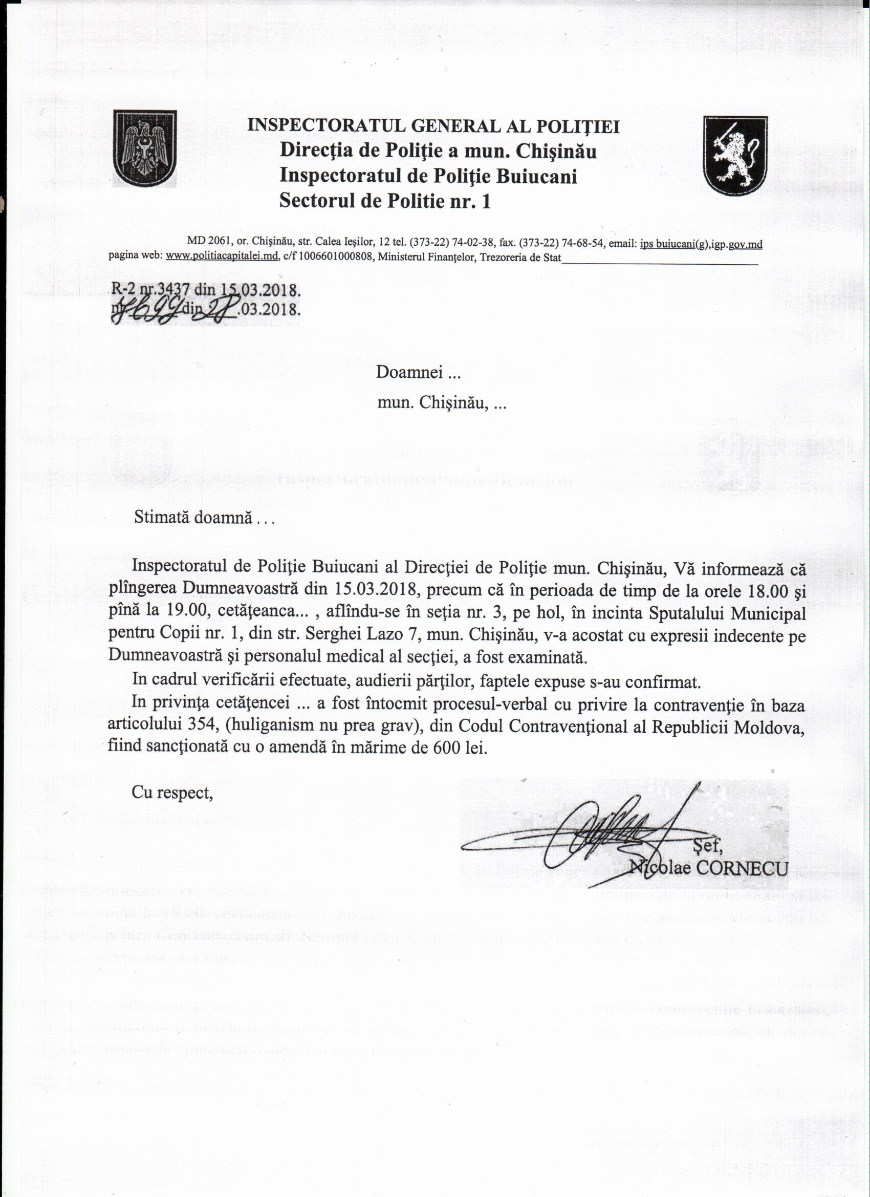 Referire facem la cazul de huliganism înregistrat la data de 15.03.18 în SCMC nr.1,care a fost luat în vizor de IP Buiucani, examinat și ulterior persoana vinovată a fost sancționată, conform prevederilor Codului Contravențional.